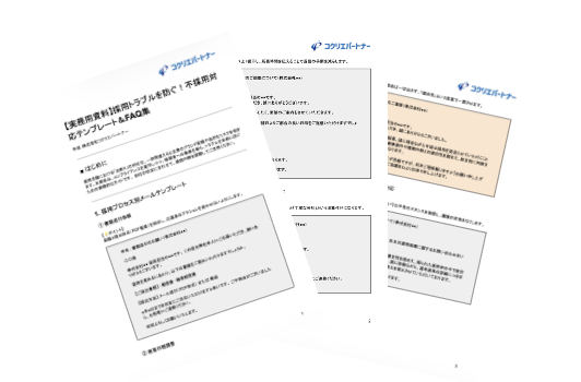 採用活動における不採用通知や年齢制限の伝え方で、もう悩みたくない方へ 。 株式会社コクリエパートナーが監修した「不採用対応テンプレート&FAQ集」を、メルマガにご登録いただいた方全員にプレゼントいたします 。本資料を活用することで、法的なNGラインを回避し、企業ブランドを守りながら誠実な採用対応が可能になります 。